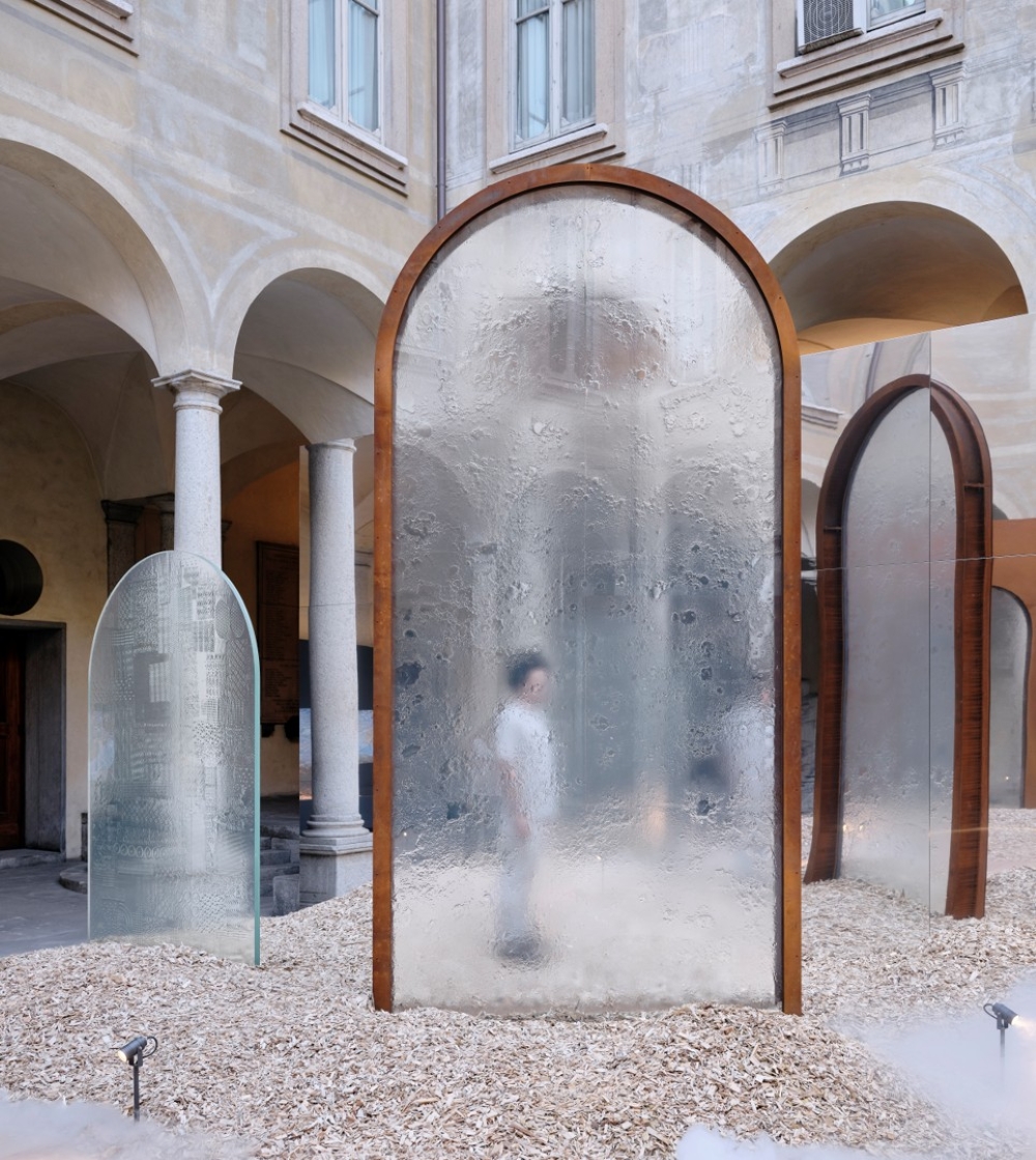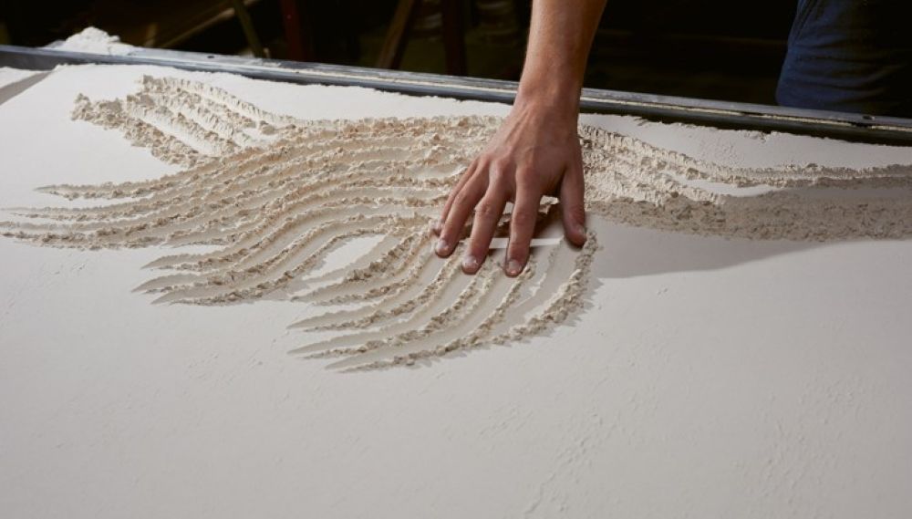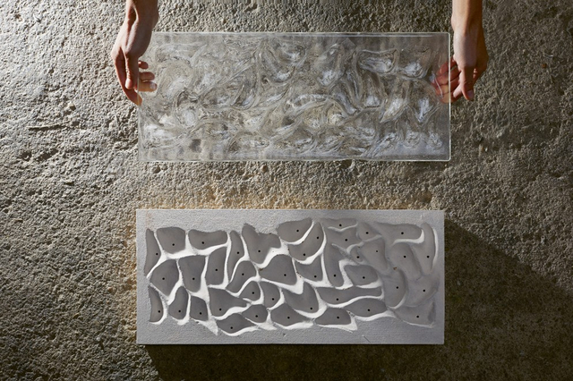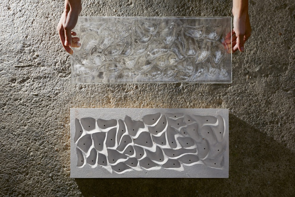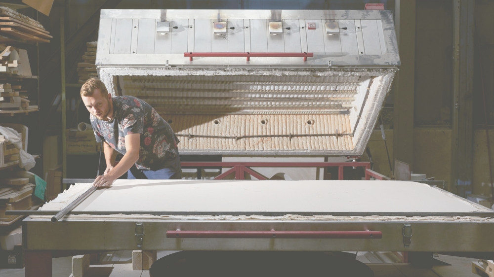 When the surface is ready, the glass is placed into the world’s largest fusing kiln, a playground for textures and vertical applications. At high temperatures, the jumbo-sized glass melts, absorbing every imprint, every gesture, until the design is locked into its surface.