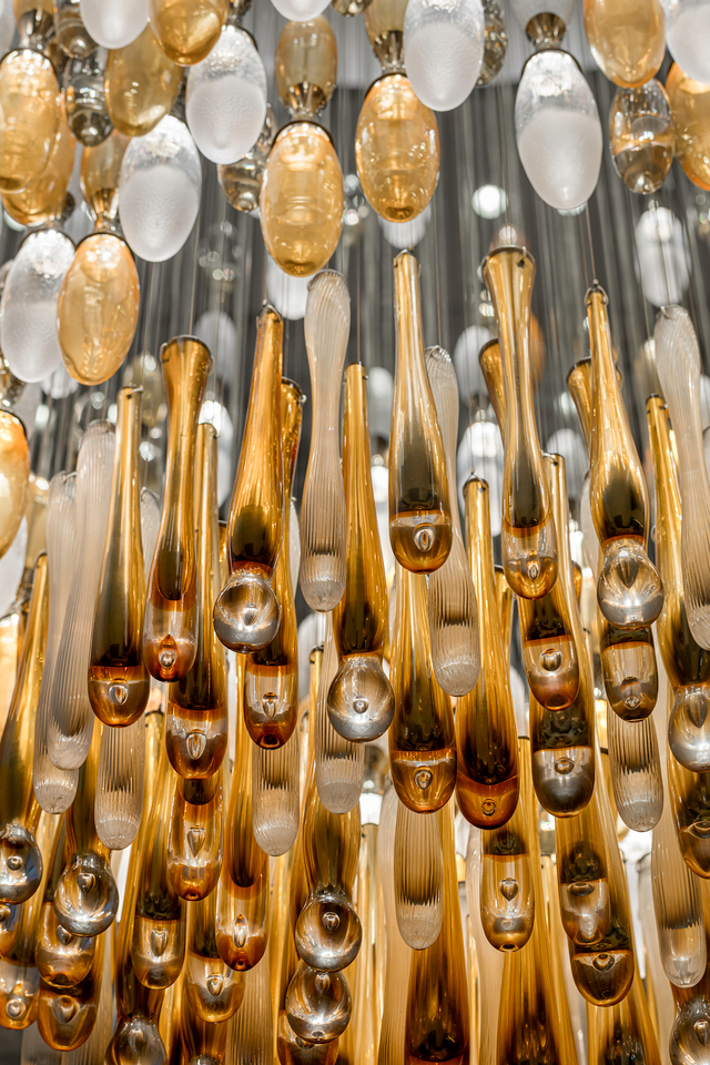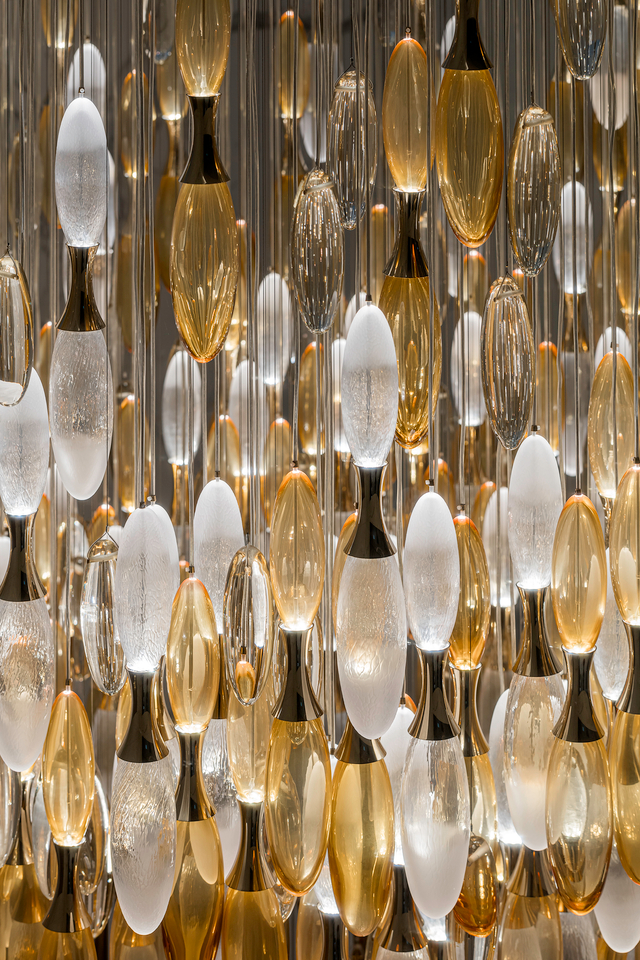 At the entrance of this private family residence in Hong Kong, a striking installation draws inspiration from the flowing nature of water, long associated with prosperity in Feng Shui. Dense elongated droplets are composed with smaller ones, all illuminated by internal LEDs, creating a sense of movement that welcomes visitors inside.