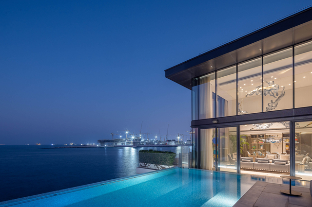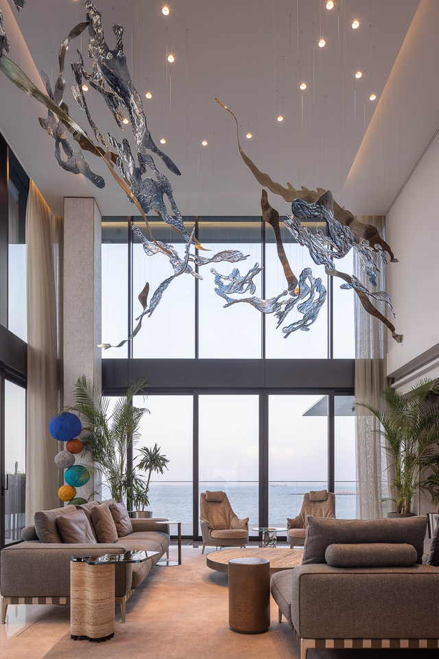 “Through monumental installations of fused glass, we have frozen the ocean’s power in time. These glass components act as a bridge, drawing the salt-misted air of the exterior deep into the interior. Inside, mysterious abyssal tones meet handcrafted metallic accents that catch the light like sunbeams striking a cresting wave. It is a space that doesn’t just house you – it moves with you.” – Martin Gallo