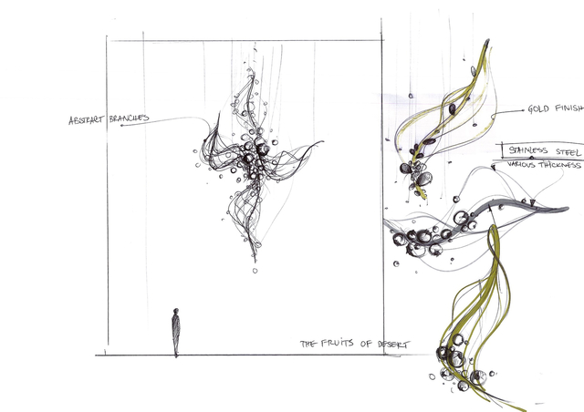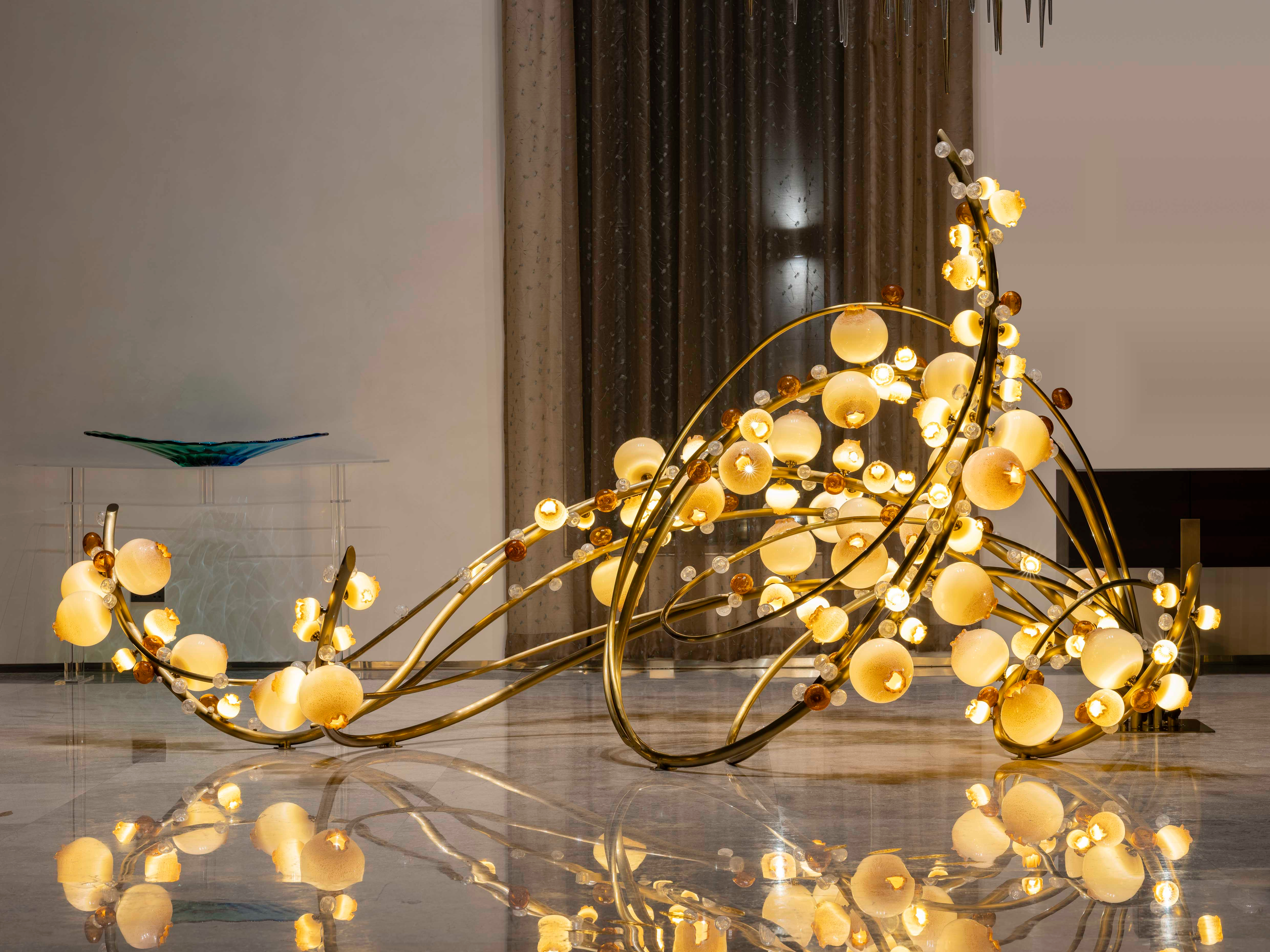 The sculpture draws from real desert flora — from chestnuts to pistachios — reimagined as a fictional plant that speaks to resilience. Over 400 handblown glass components in warm amber tones are set along 60 meters of sculpted golden branches. Each fruit differs slightly in tone, but all share the same story behind the light.