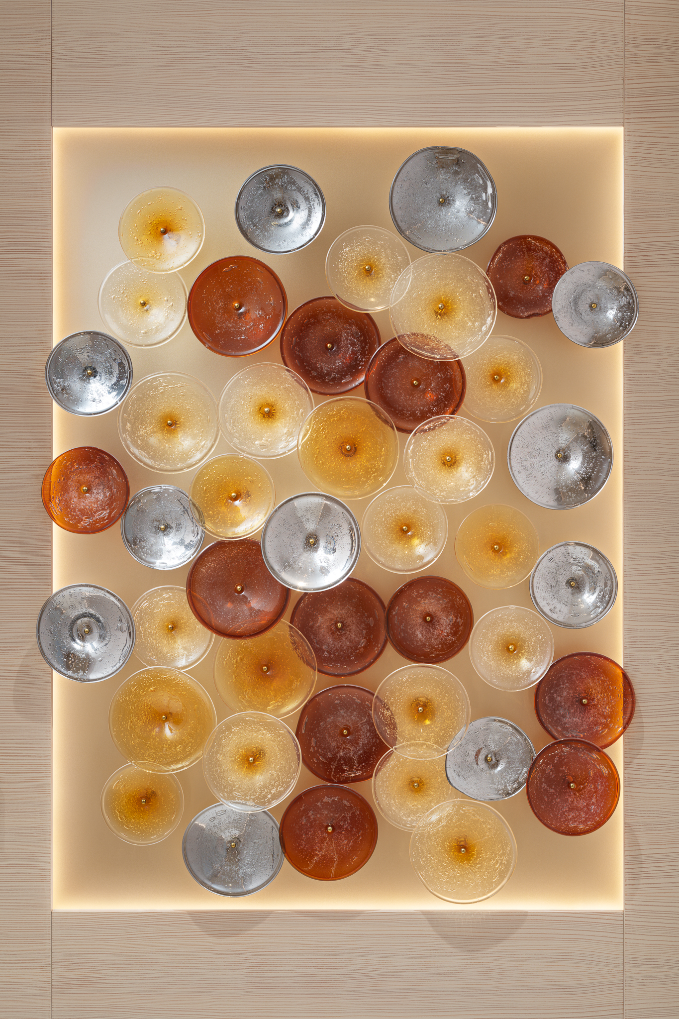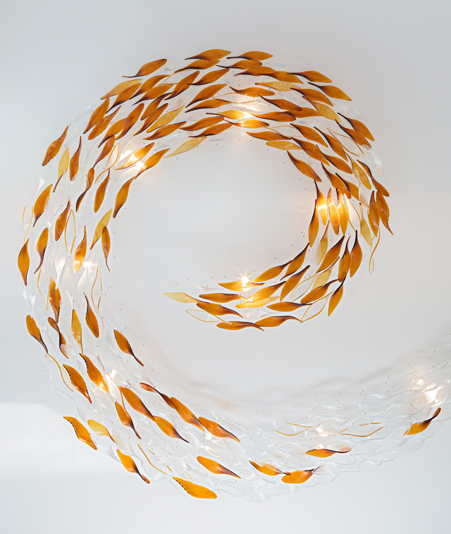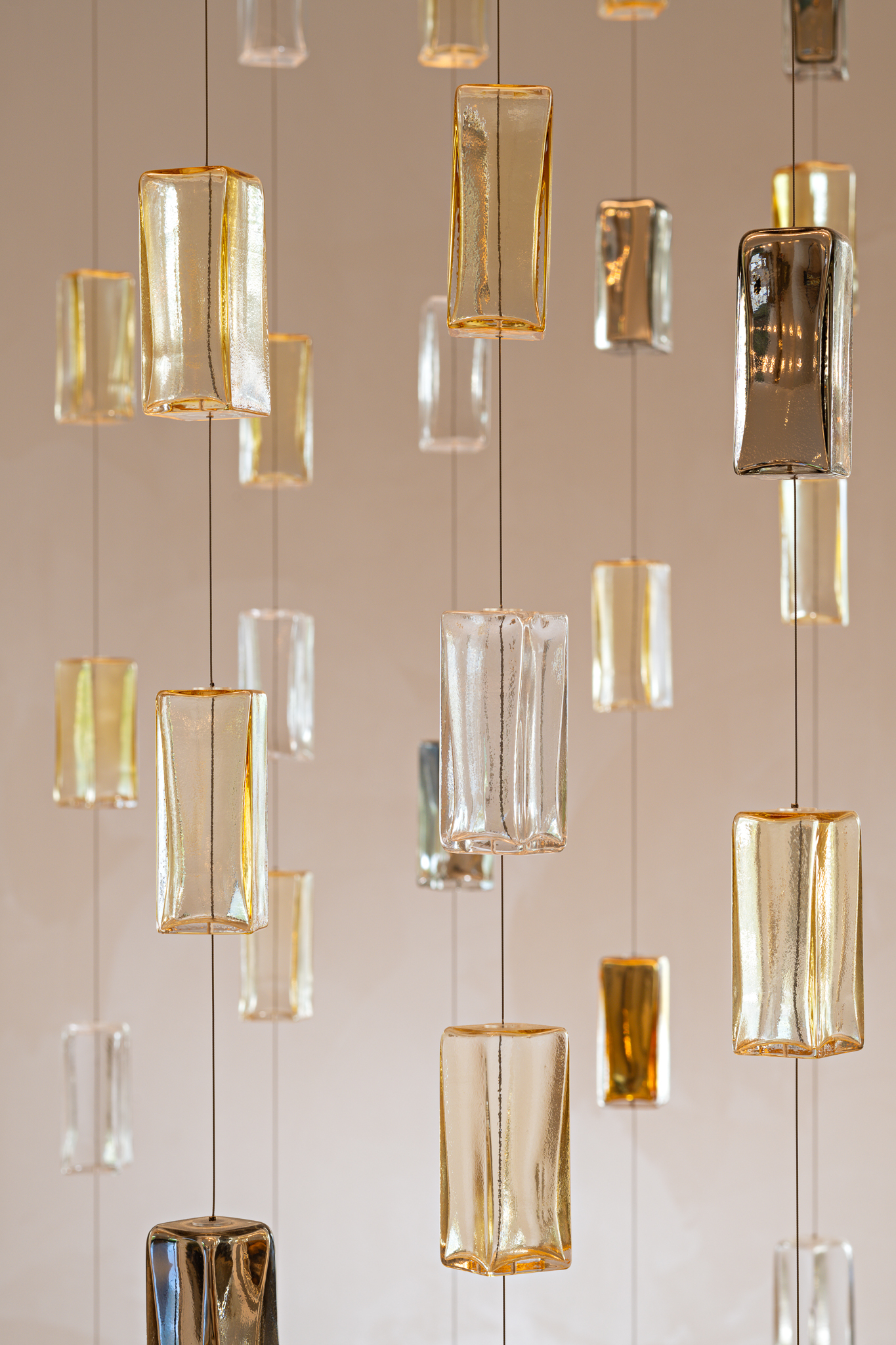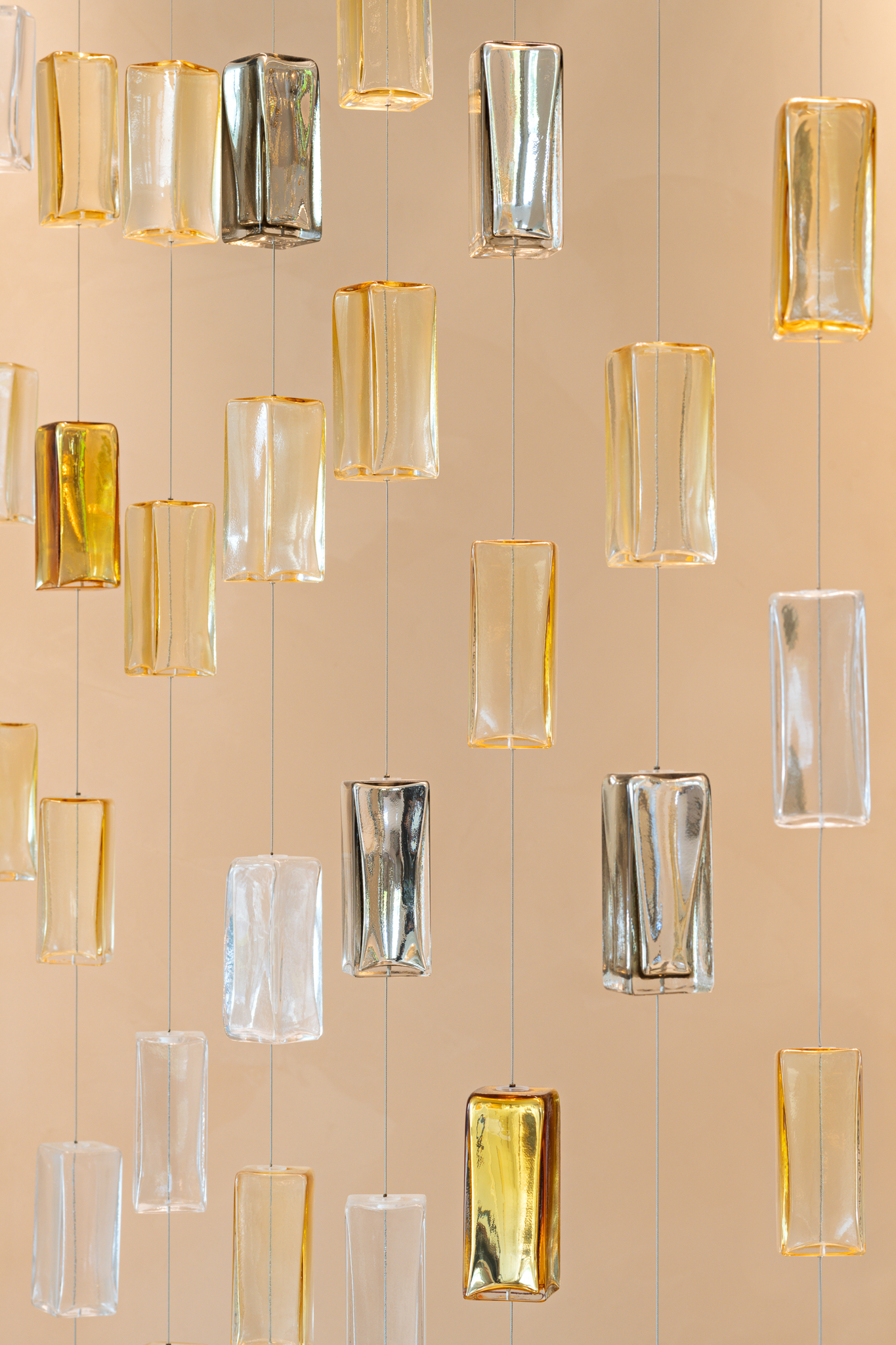 Inspired by shimmers suspended in the air, Golden Partition evokes the warmth of home and the quiet glow of fire. To capture this feeling, three hundred hand blown components were hung in shades of light amber, smoke, and clear. Some remain transparent, others soften to opacity, a few are silvered inside and flicker like embers.