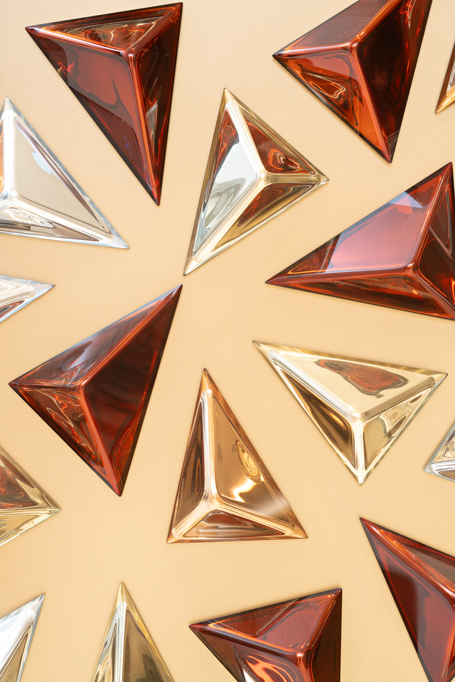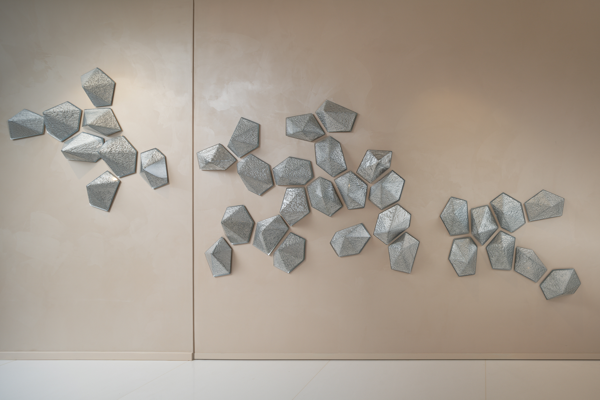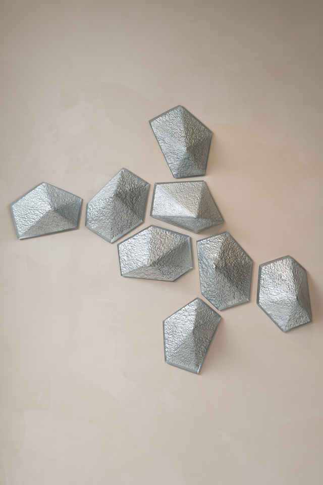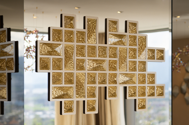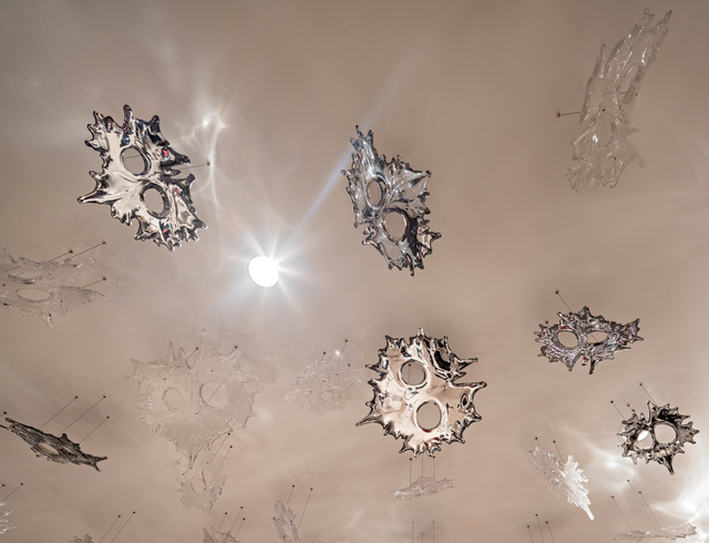 Inspired by shimmers suspended in the air, Golden Partition evokes the warmth of home and the quiet glow of fire. To capture this feeling, three hundred hand blown components were hung in shades of light amber, smoke, and clear. Some remain transparent, others soften to opacity, a few are silvered inside and flicker like embers.