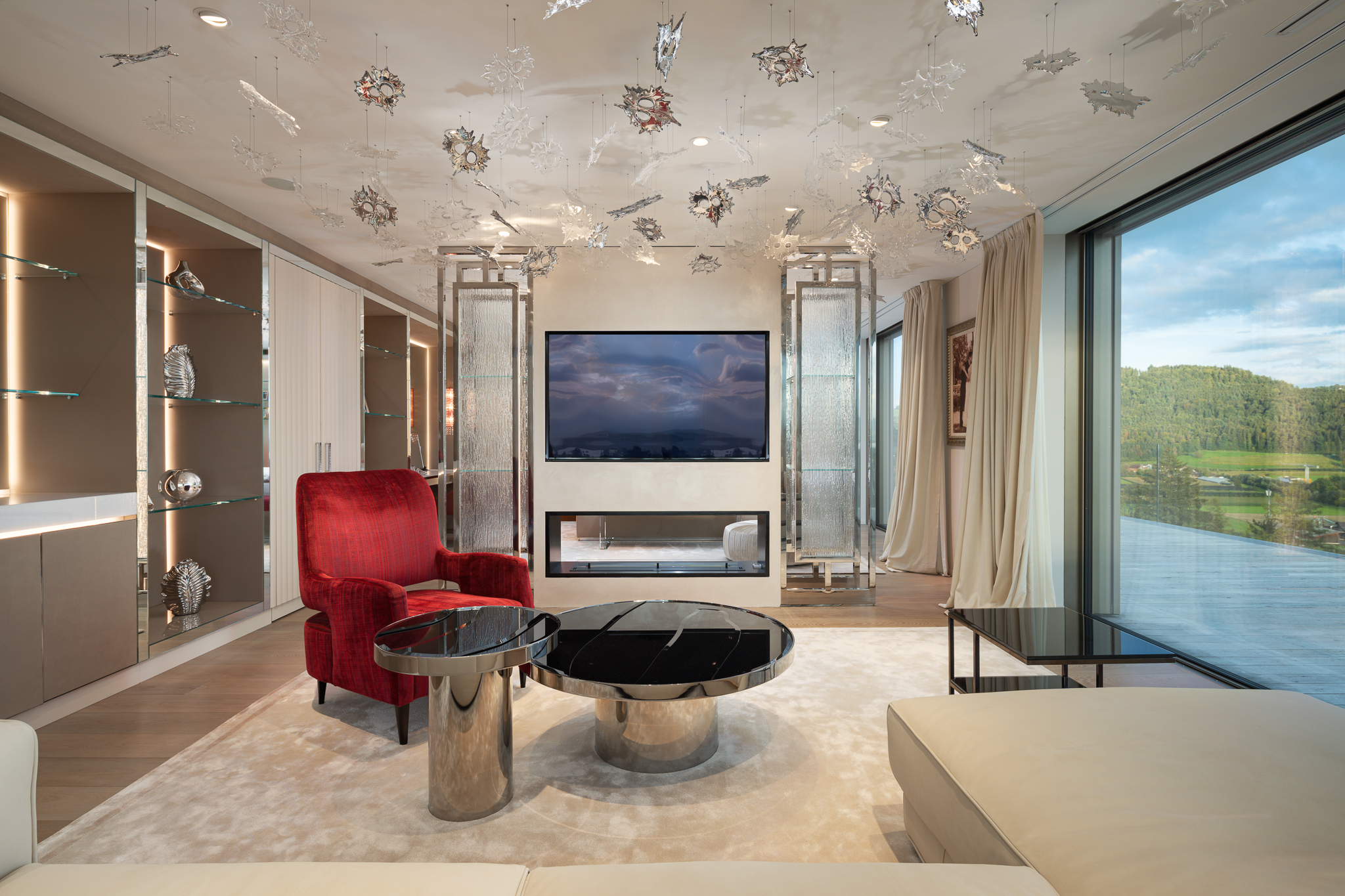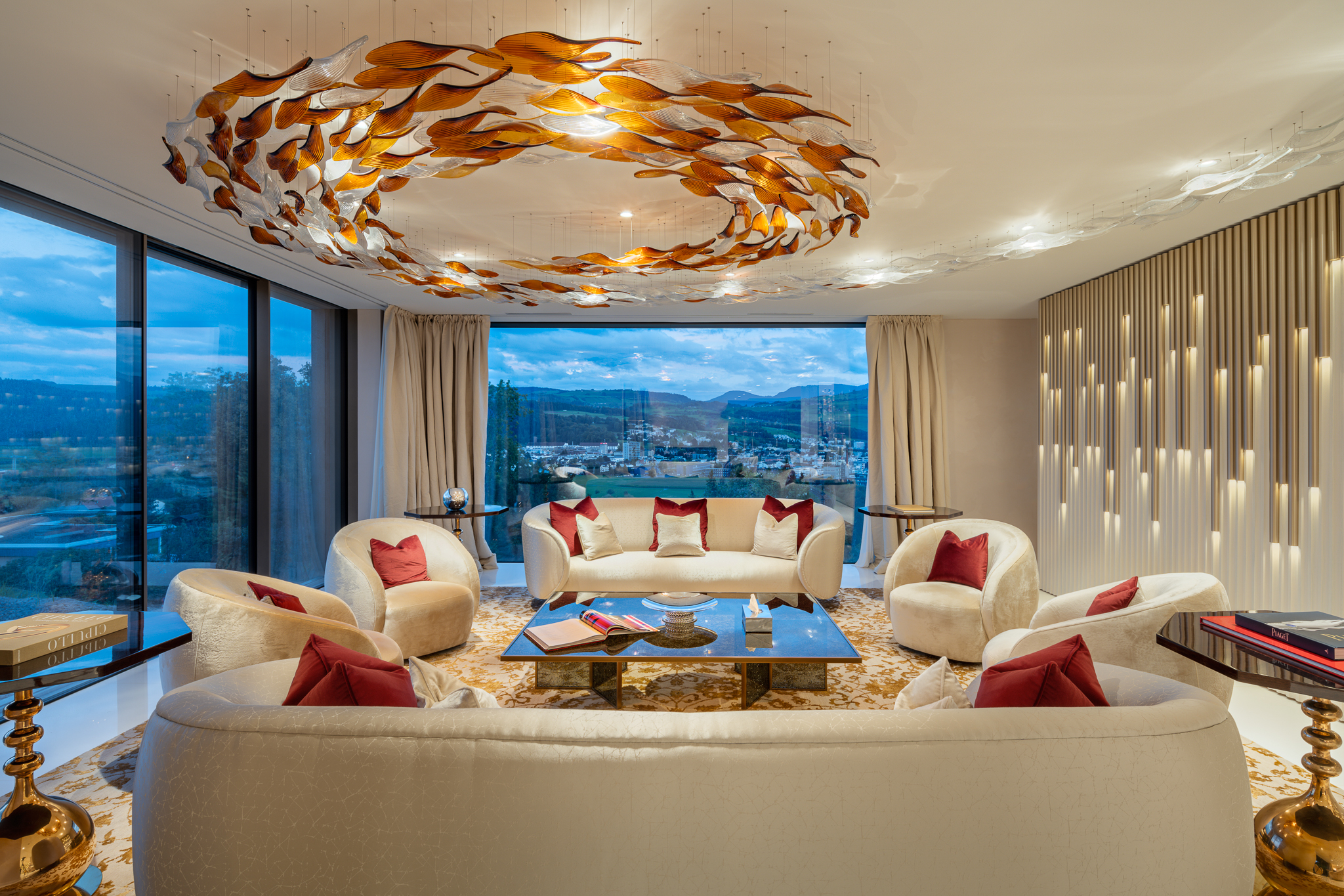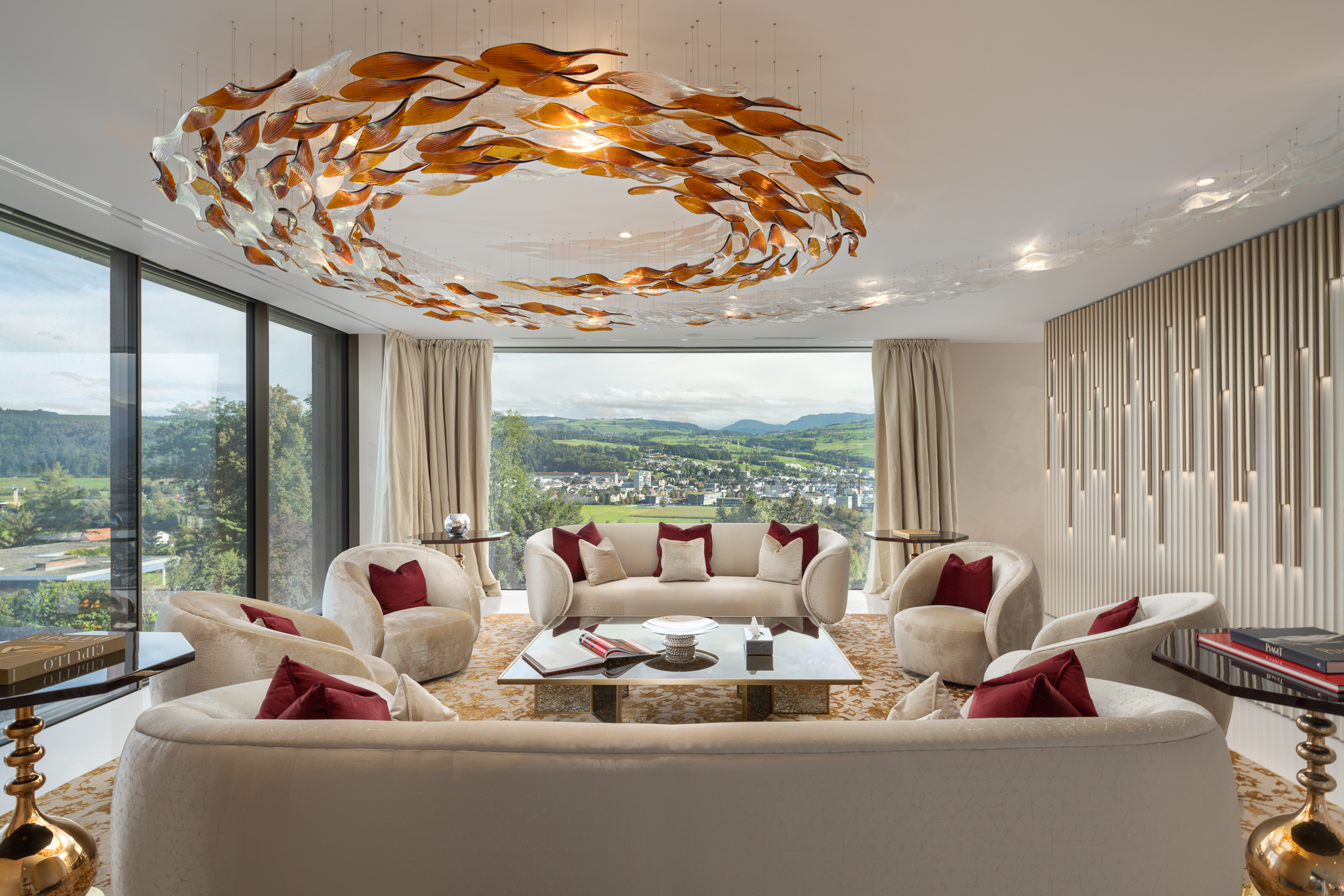 A crown of handblown Bohemian crystal spirals across the ceiling, its rippled leaves in amber and clear glass. Daylight from the wide window plays through the piece, reflecting the green sweep of the Zug valley. By night it warms to a gentle glow, gathering the room into a calm center for conversation.