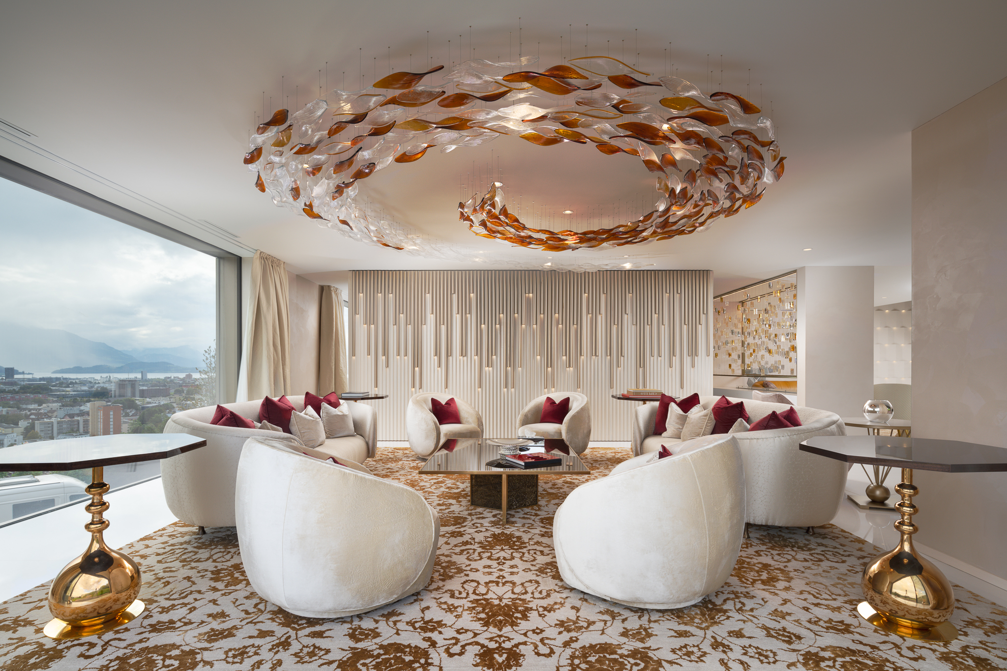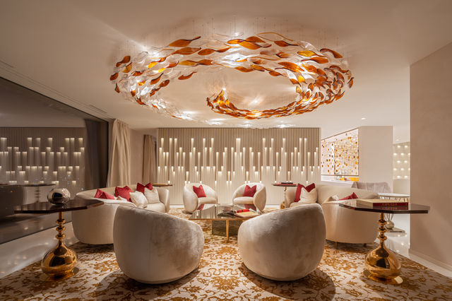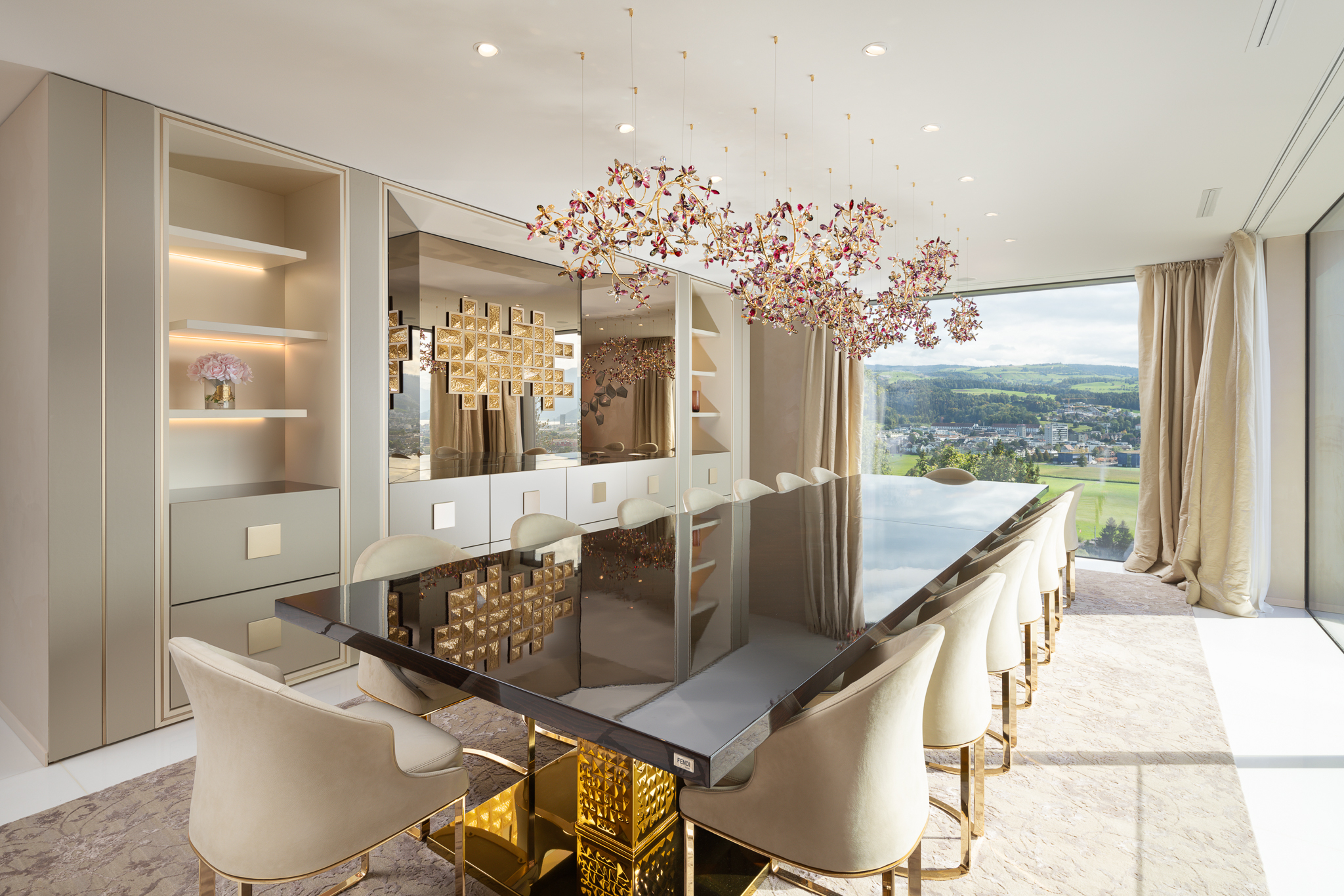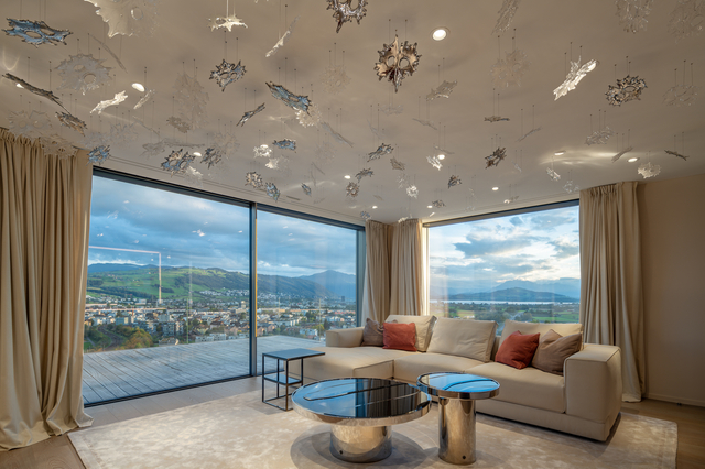 A crown of handblown Bohemian crystal spirals across the ceiling, its rippled leaves in amber and clear glass. Daylight from the wide window plays through the piece, reflecting the green sweep of the Zug valley. By night it warms to a gentle glow, gathering the room into a calm center for conversation.